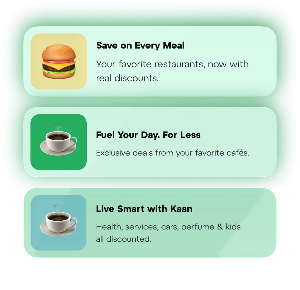 From restaurants to coffee, health, cars, and more — Kaan brings you verified offers from top brands across Saudi Arabia.
